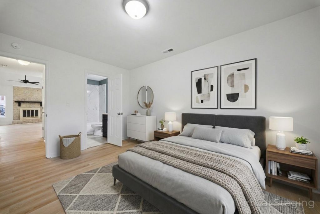 Stonebridge Landing Wb, CHESAPEAKE. This newly updated townhome in Chesapeake offers 3 bedrooms and 2 bathrooms. The spacious living room with a beautiful brick fireplace flows into the dining area and kitchen, which features stainless steel appliances. On the main floor, you'll also find a laundry closet, a full bathroom, and two bedrooms. Upstairs, the private primary suite includes an ensuite bathroom and a walk-in closet. Additional highlights include ceiling fans, updated lighting, a fenced yard, and off-street parking. Don’t miss the opportunity to make this home yours, schedule a showing today! Please note, some photos use virtual staging to illustrate the home's potential.